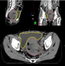 Fig. 1. Ct image simulation of sagittal, cortical and axial pieces with residive mass on the vaginal punctum (red). Note that “Fig.” is abbreviated. There is a period after the figure number, followed by two spaces. It is good practice to explain the significance of the figure in the caption.